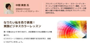 私は本講座にて、「実践ビジネスカラーレッスン」を2年前から担当しています。第一印象、信頼感、安心感、そしてその人らしさ、言葉になる前に相手へ伝わる、重要な非言語コミュニケーションツールです。